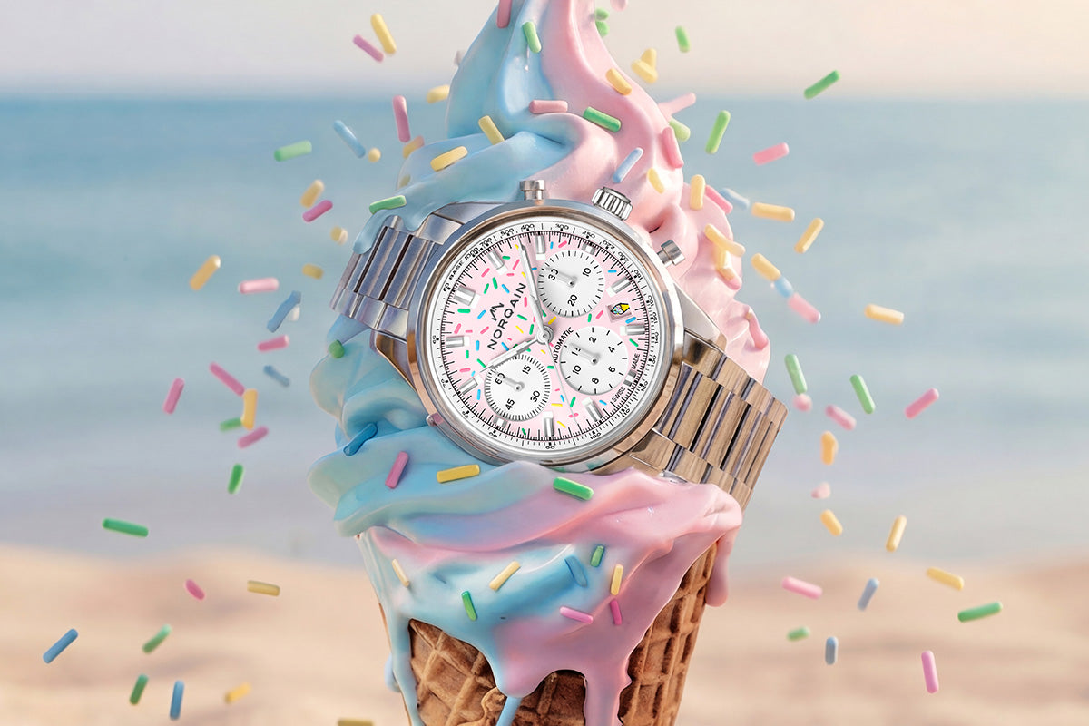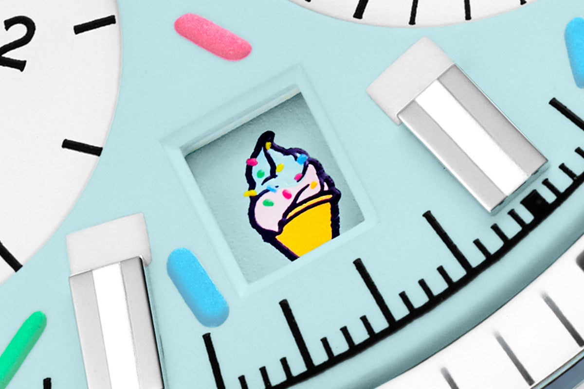 Cette montre en acier inoxydable de 40 mm est proposée en deux versions de cadran vibrantes, « Strawberry » et « Blue Raspberry ». Chaque cadran présente une finition mate, décorée de manière artistique et inspirée des toppings de glaces à l’italienne. Grâce au Super-LumiNova®, les détails s’illuminent en bleu dans l’obscurité, pour prolonger le plaisir après la tombée de la nuit.
