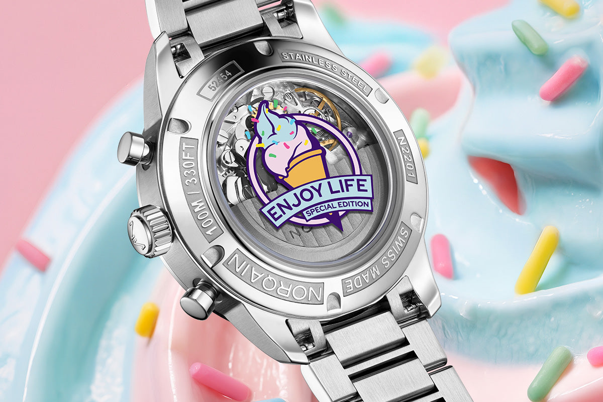 Une fois tous les sept jours, le guichet de date situé entre 4 et 5 heures révèle une surprise ludique : une glace à l’italienne garnie de vermicelles. Un petit détail porteur d’un message simple, Enjoy Life.