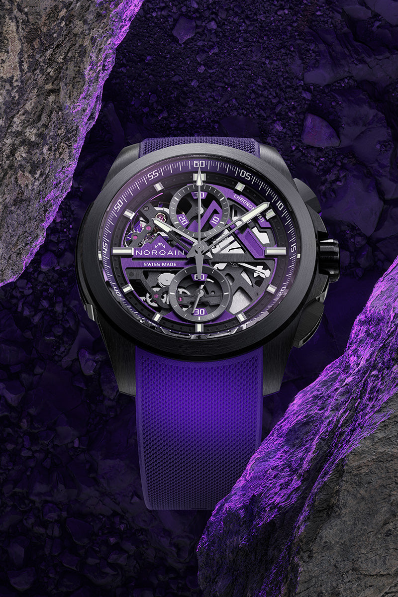 L'Independence Skeleton Chrono est dotée du Calibre Manufacture NORQAIN 8K, un mouvement chronographe flyback squeletté exclusif de haute performance inspiré des plus hautes montagnes du monde. Ce modèle est le premier chronographe de la collection Independence.