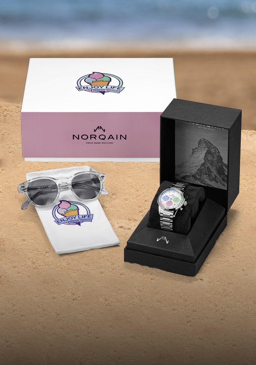 NORQAIN創業者兼CEOのベン・カッファーは次のように語っています:「“Enjoy Life” スペシャルエディションは、誰の中にもいる“子ども心”へのオマージュでもあります。デイト表示の小さなアイスクリームは、ただの遊び心のあるデザインではなく、“もっと肩の力を抜いて人生を楽しもう”というメッセージなのです。子どもの頃の記憶を呼び起こしたり、今の子どもたちの笑顔と重ねたり――この時計は、そんな“ピュアで心が弾むようなエネルギー”を、あなたの毎日に届けてくれます。」