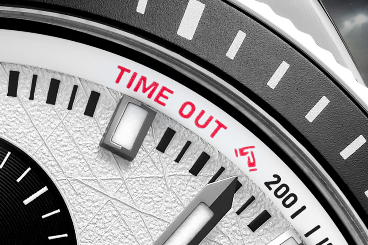 A white inner bezel with a pulsometer features a heartbeat indicator and a timeout symbol at the 200 mark, serving as a purely graphic and whimsical reference to the pace and intensity of the game, a symbolic reminder to catch your breath.