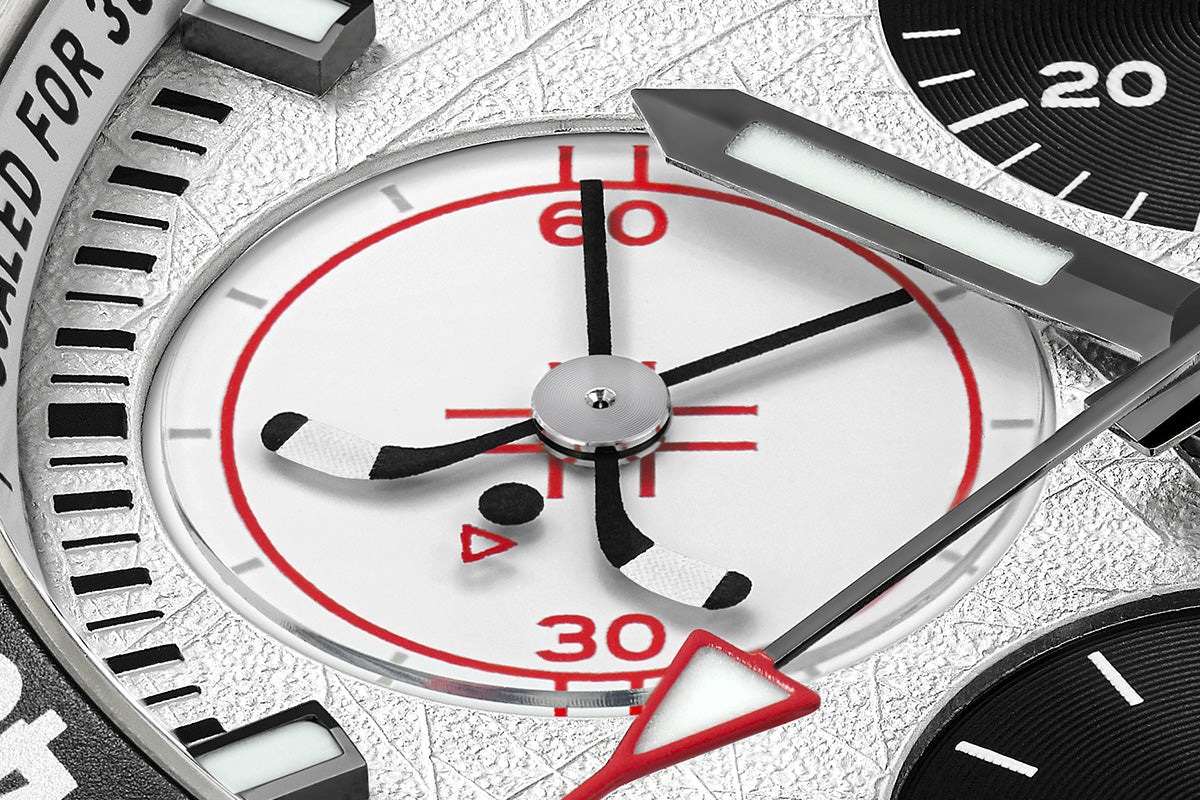 Inspired by the raw surface of the ice hockey rink, the white “scratched ice” dial captures the intensity of the game from the first face-off to the final second.