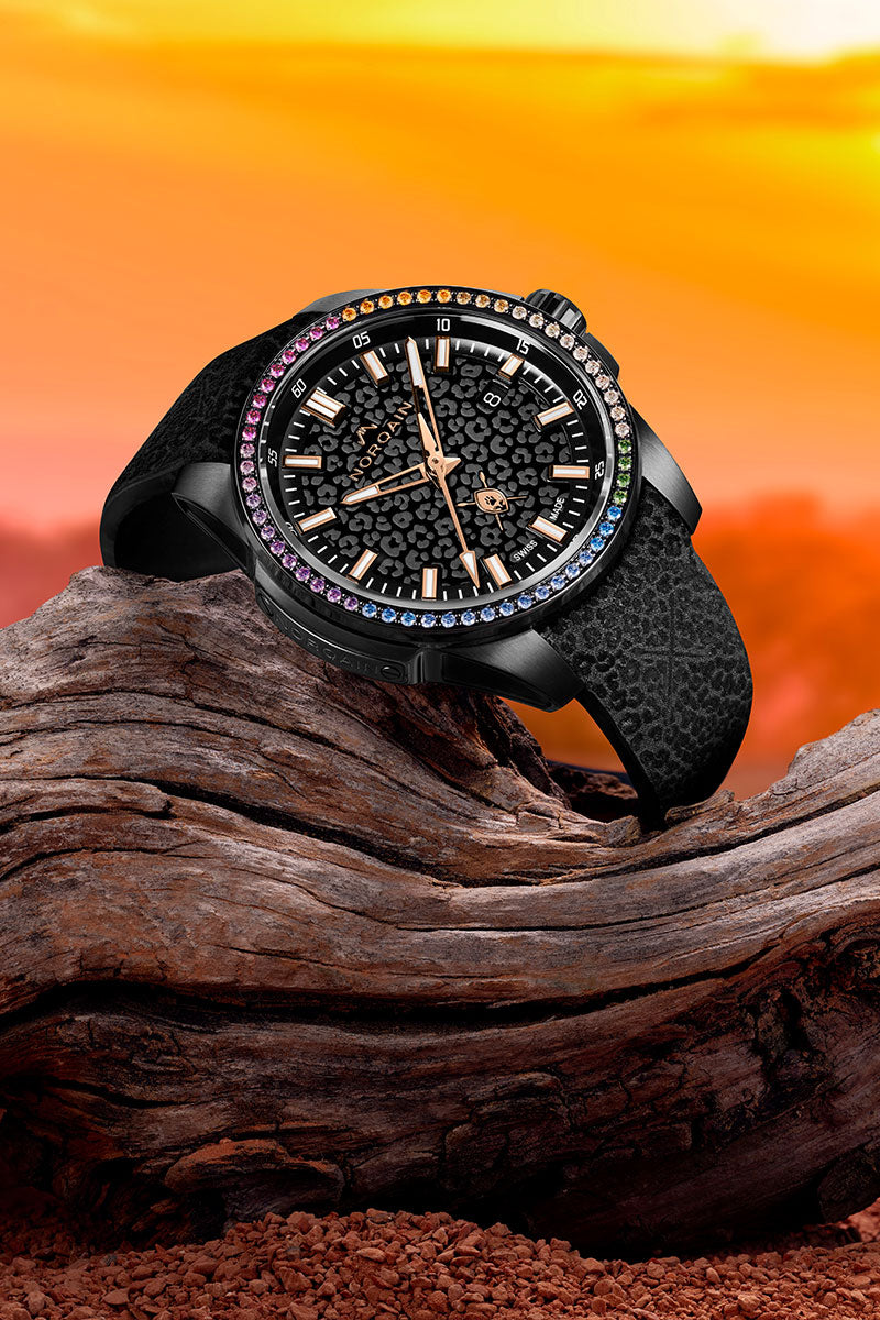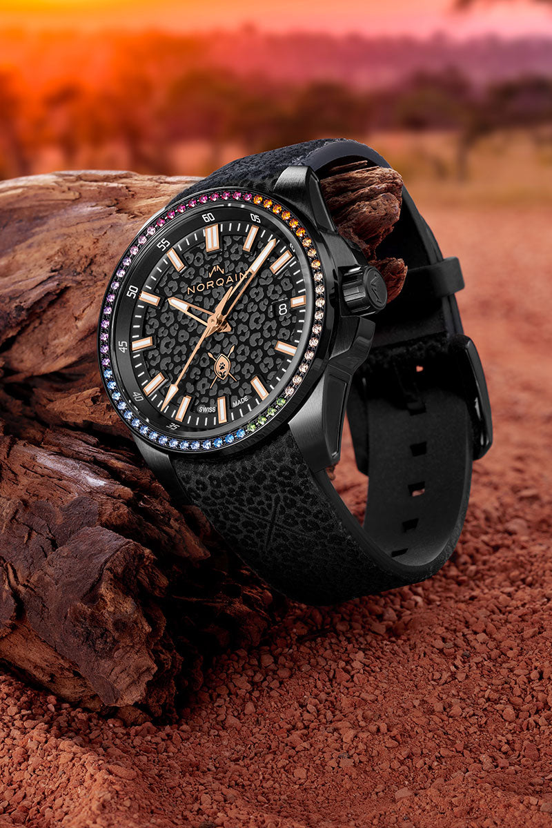 Designed in collaboration with NORQAINER and wildlife ambassador Dean Schneider, this 40mm Independence makes an unforgettable impression with its leopard-print pattern on the black dial. 10% of the earnings of sales from this timepiece will be donated to the Hakuna Mipaka Oasis. This timepiece is limited to 100 pieces.