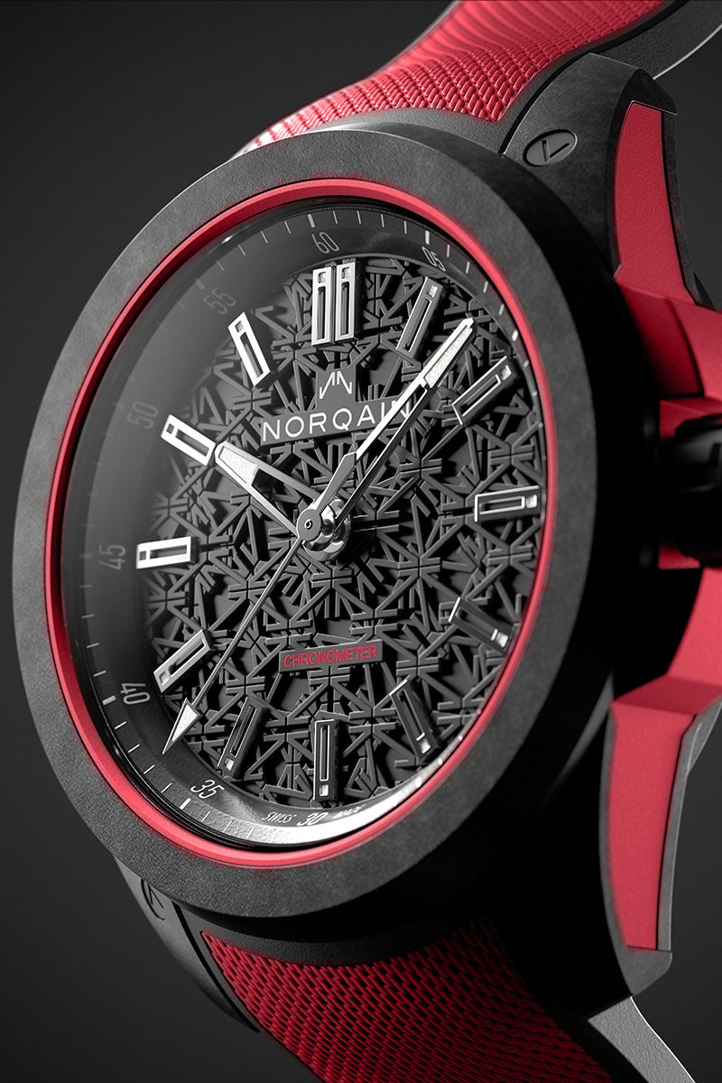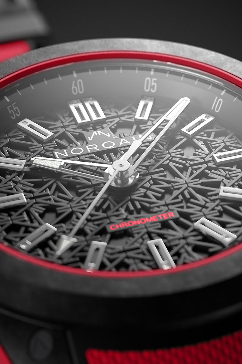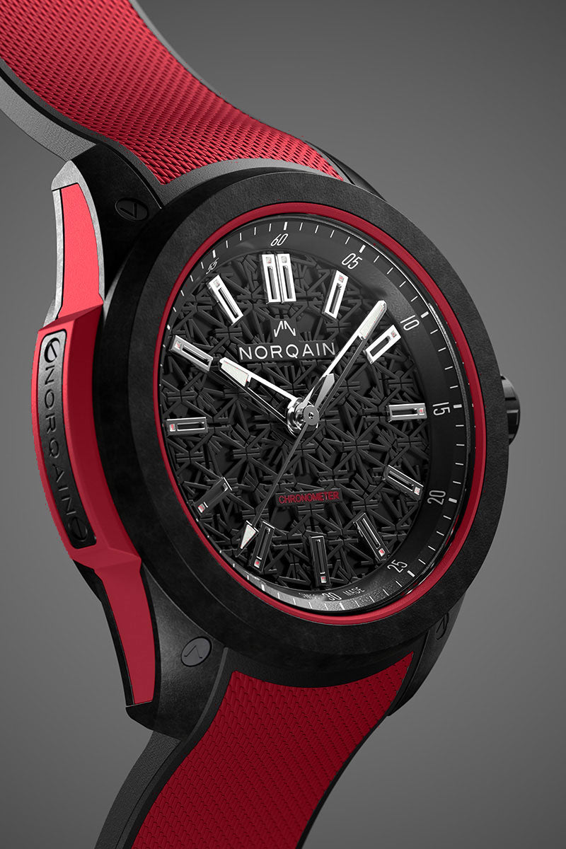 The Wild ONE, made with our proprietary, ultra-robust, and ultra-light NORTEQ carbon fibre material, is the ultimate high-performance sports watch. Six times lighter than steel and 3.5 times lighter than titanium this Wild ONE has been designed in collaboration with Jean-Claude Biver, the NORQAIN team and the best Swiss suppliers.